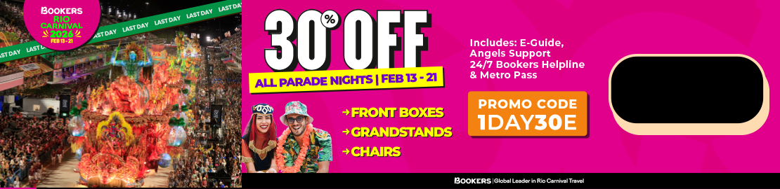 Guided Transfer to the Sambadrome. Buy your ticket package in sectors 2, 4, 6, 8 or 10. Go to and from the Sambadrome in the company of Bookers Angels. Daily departure from the Service Center, always at 7 pm. T-shirt and subway ride on us.