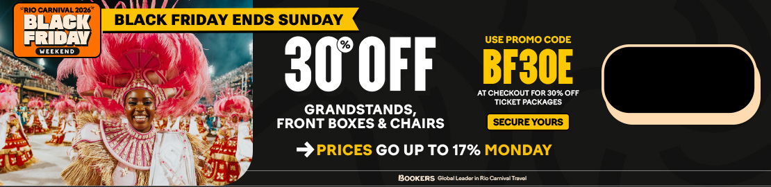 Guided Transfer to the Sambadrome. Buy your ticket package in sectors 2, 4, 6, 8 or 10. Go to and from the Sambadrome in the company of Bookers Angels. Daily departure from the Service Center, always at 7 pm. T-shirt and subway ride on us.