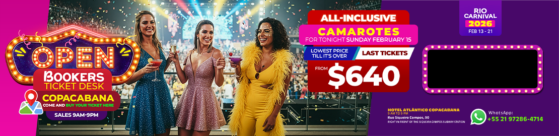 Guided Transfer to the Sambadrome. Buy your ticket package in sectors 2, 4, 6, 8 or 10. Go to and from the Sambadrome in the company of Bookers Angels. Daily departure from the Service Center, always at 7 pm. T-shirt and subway ride on us.