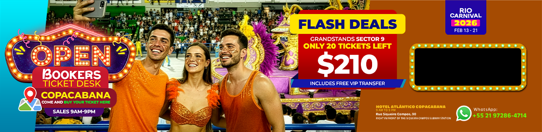 Guided Transfer to the Sambadrome. Buy your ticket package in sectors 2, 4, 6, 8 or 10. Go to and from the Sambadrome in the company of Bookers Angels. Daily departure from the Service Center, always at 7 pm. T-shirt and subway ride on us.